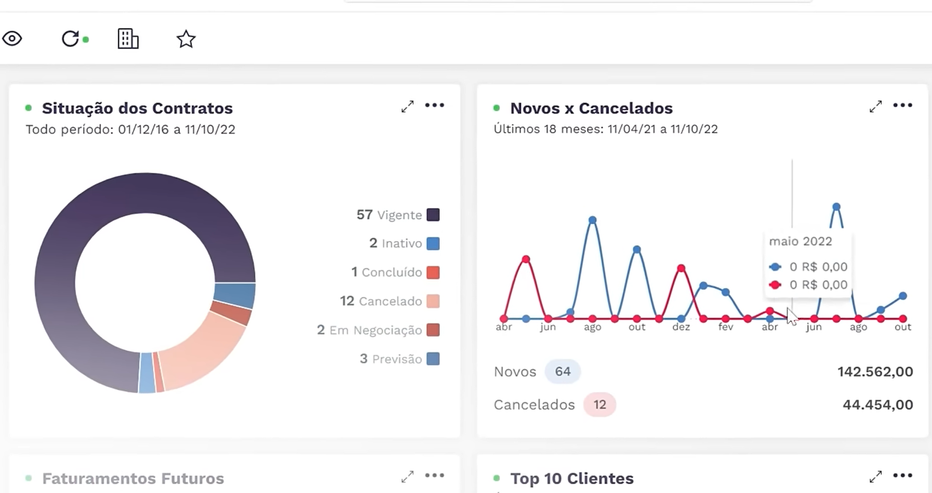 Abrange diferentes tipos de serviços e modalidades, incluindo contratos simples, com itens, adicionais e medições. Controle de faturamento, previsões financeiras e ajustes contratuais, como reajustes, suspensões, adiamentos e parcelamentos.