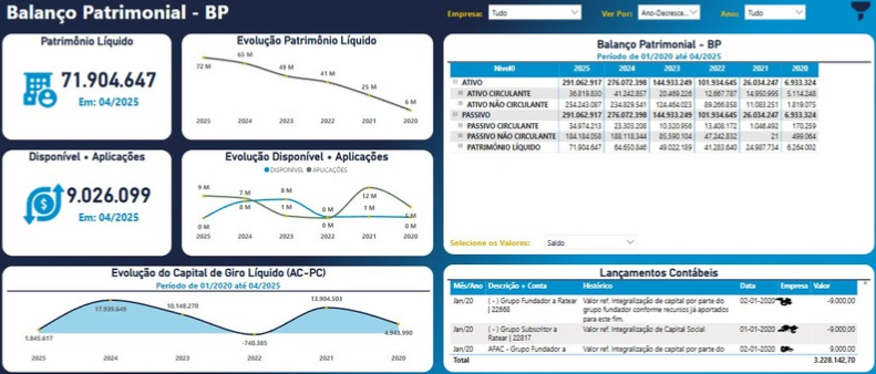 • Demonstrativo de Resultados (DRE) com detalhamento e drill-down